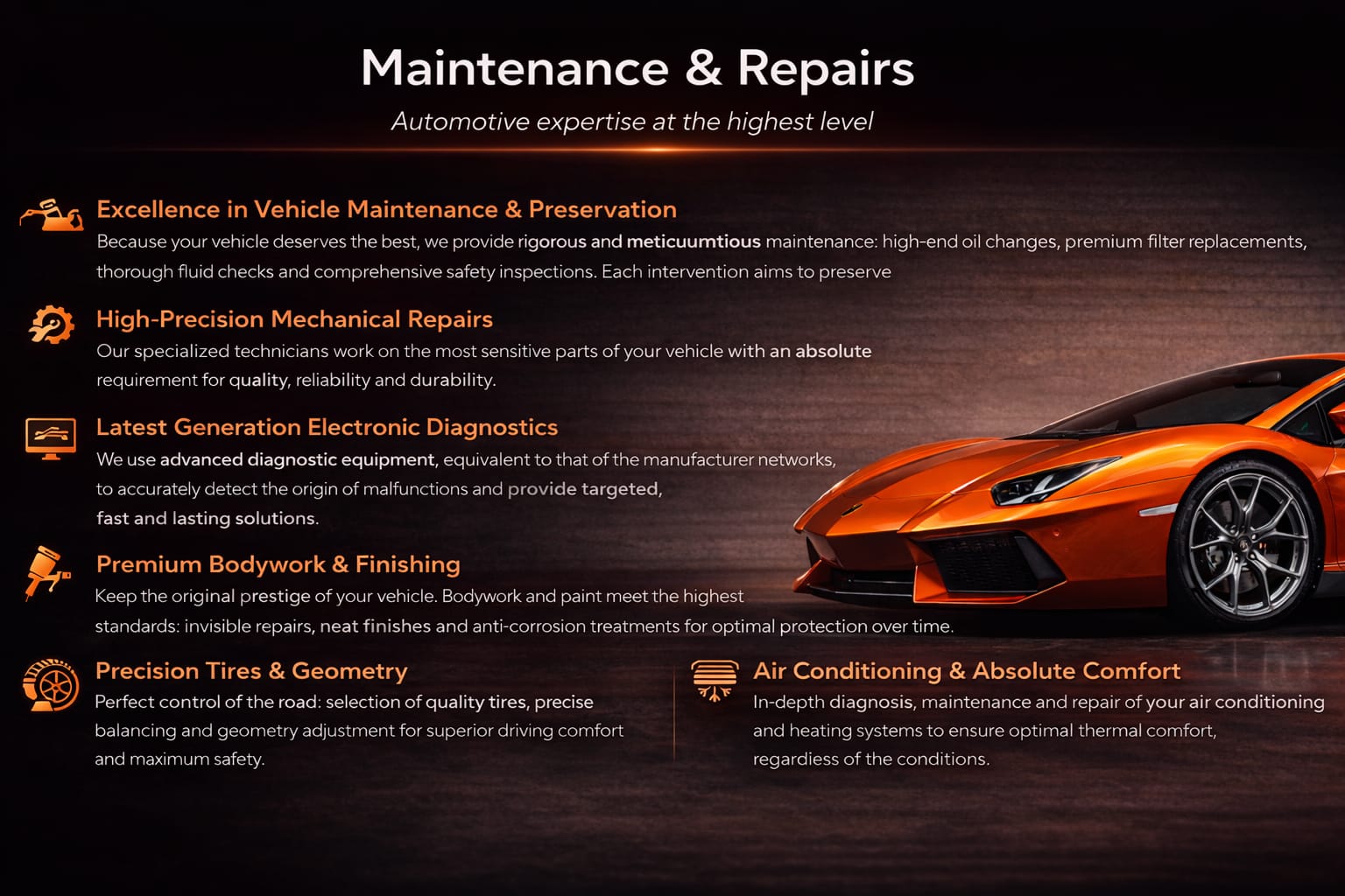 Parce que votre véhicule mérite le meilleur, nous assurons un entretien rigoureux et méticuleux : vidanges haut de gamme, remplacement de filtres premium, contrôles approfondis des fluides et inspections de sécurité complètes. Chaque intervention vise à préserver la performance, la fiabilité et la valeur de votre automobile.